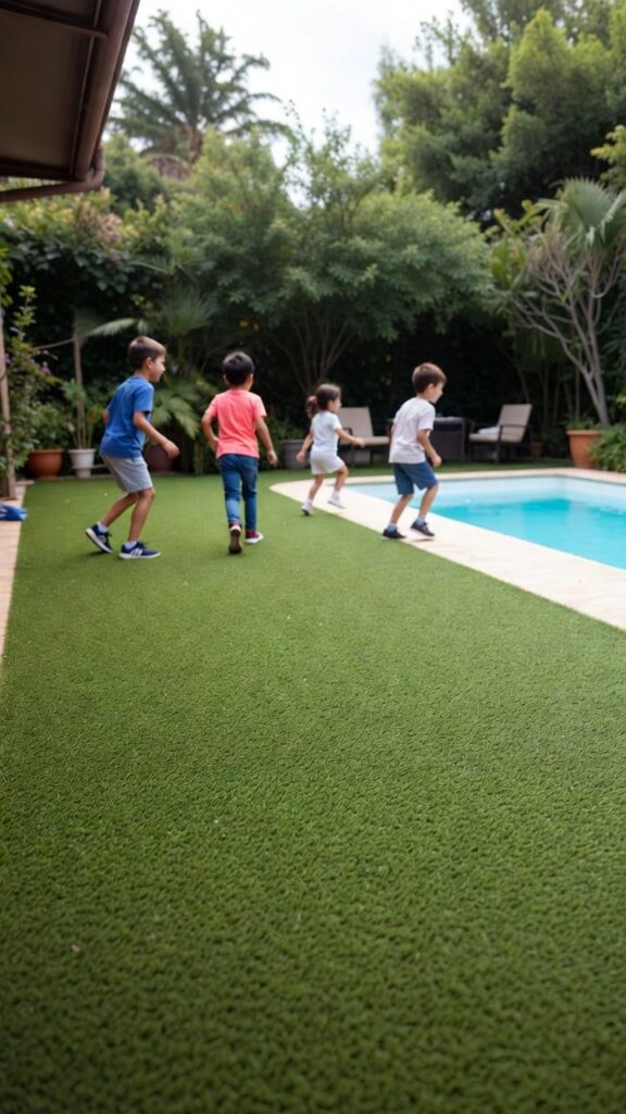 Mira cómo se lo pasan estos niños en espacios reales con nuestro césped artificial para peques – ¡puro disfrute y cero preocupaciones!